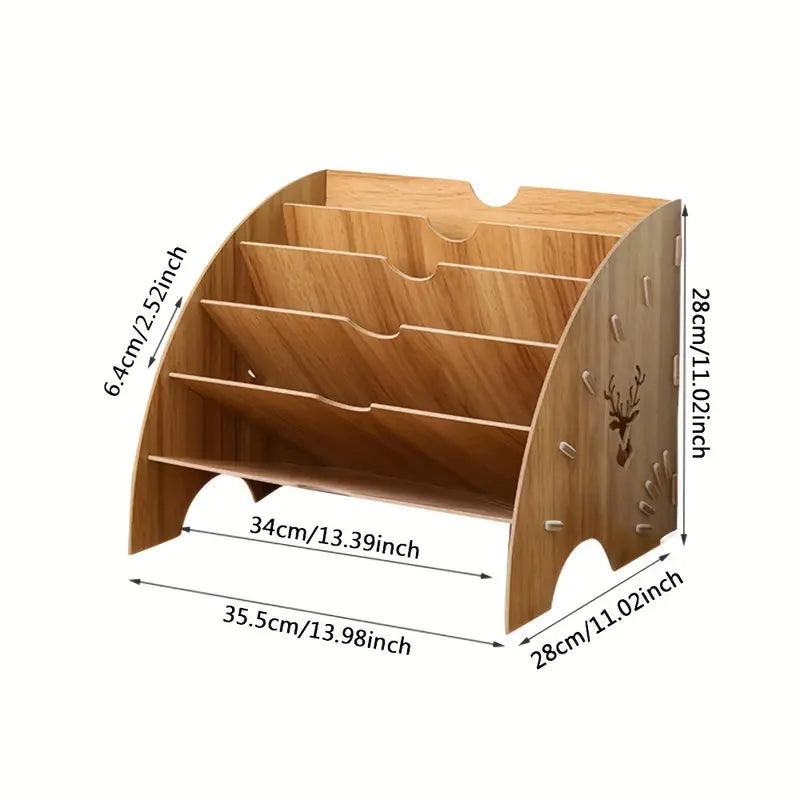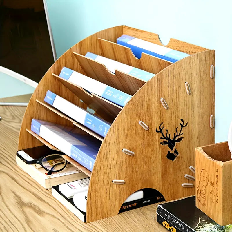 Organize your workspace in style with this wooden fan‑shaped desktop organizer featuring an elegant deer head carved design. With 5 spacious layers, it’s perfect for storing files, books, phones, stationery, and accessories while adding a touch of sophistication to your desk.